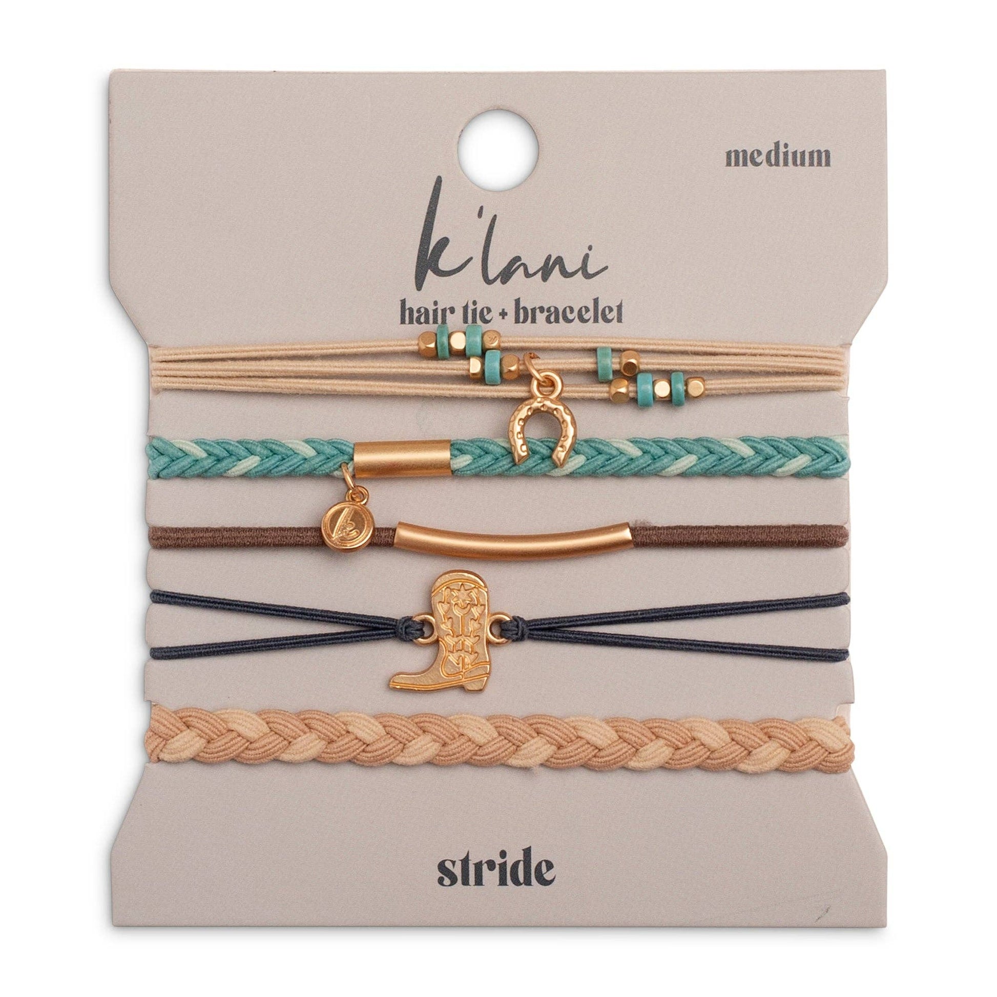 Our Stride set includes five bracelets that double as hair ties in the cutest coastal cowgirl colors of blue, brown, cream and teal. This set features dainty boot and horseshoe gold charms that will remind you to lengthen your stride and cowgirl up.