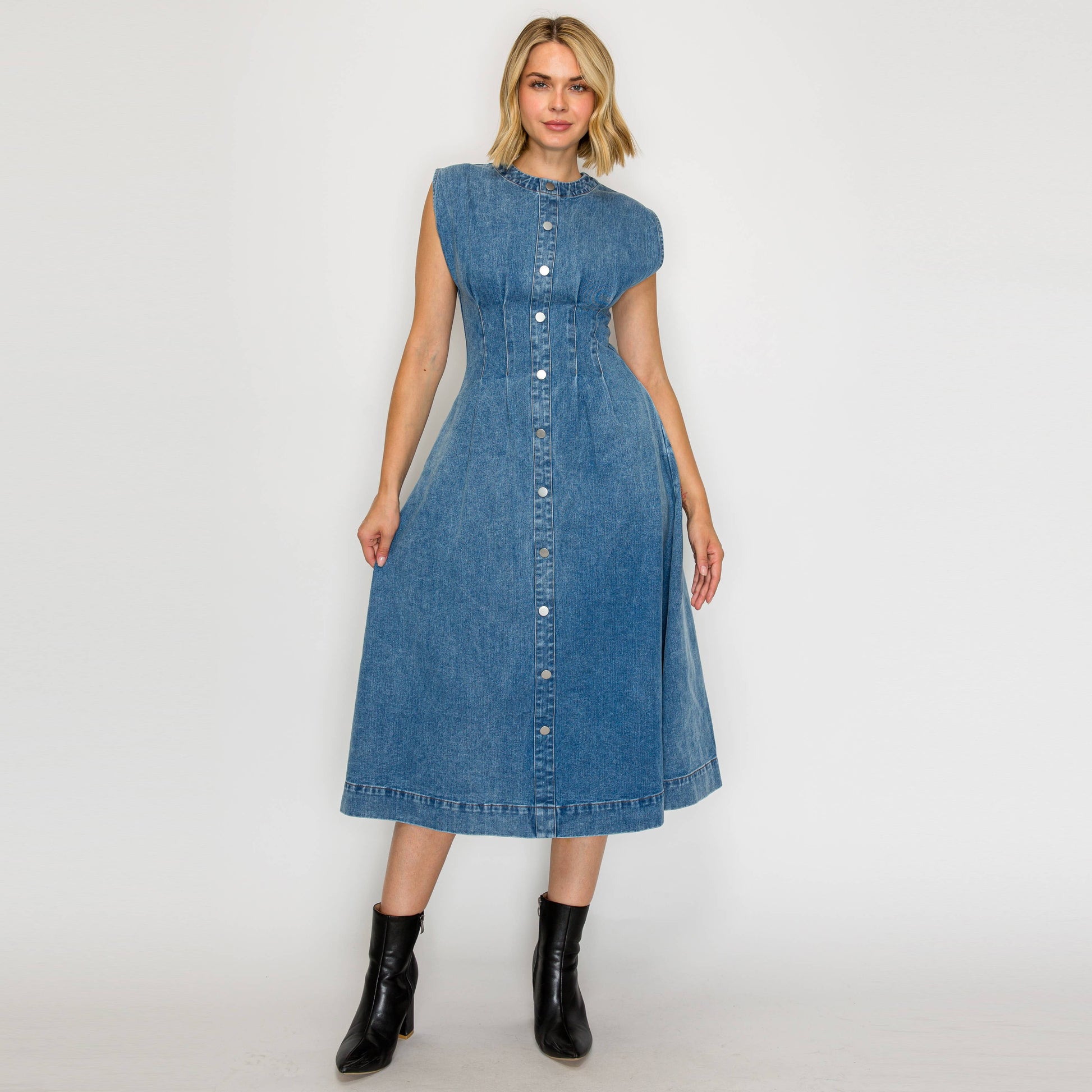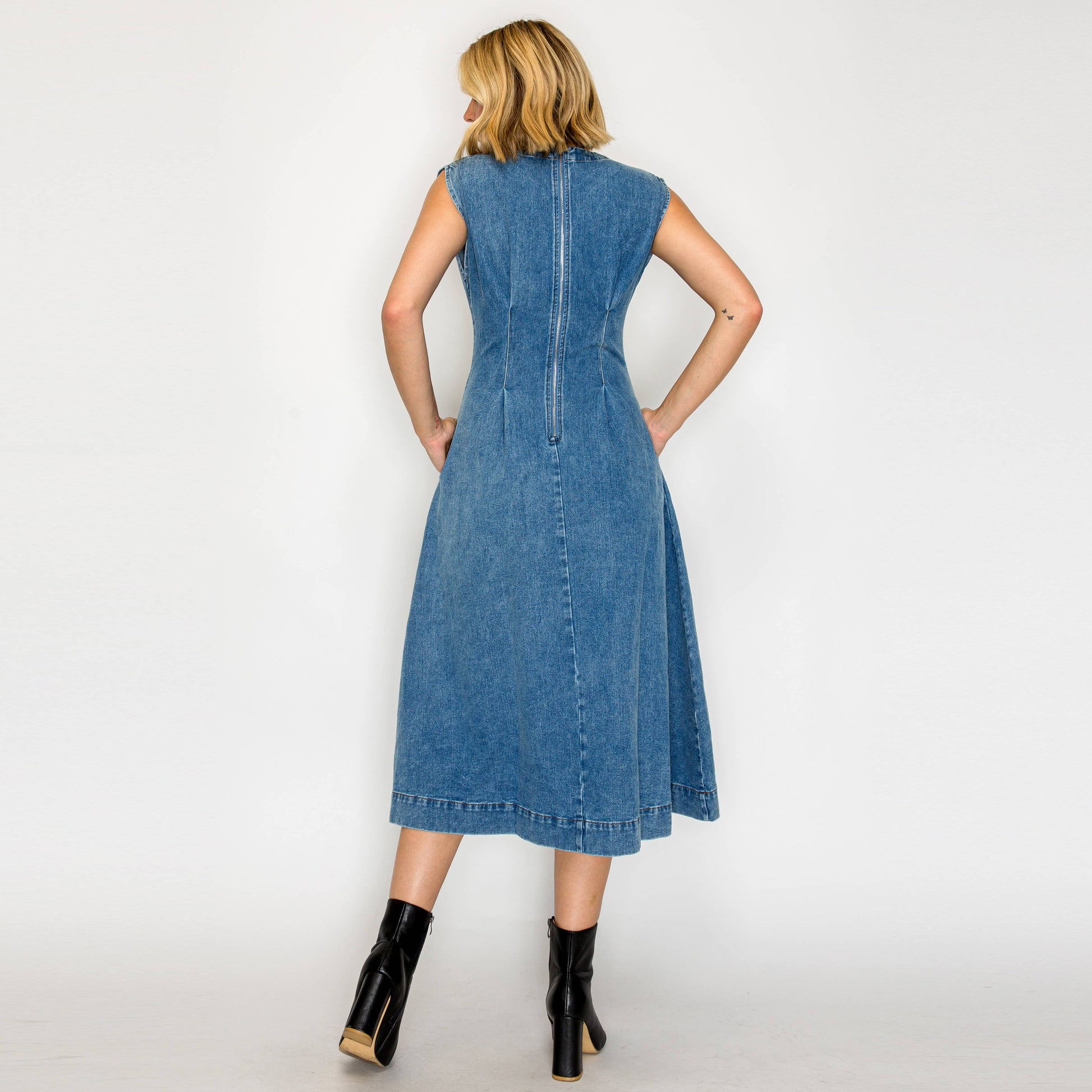 - Crafted from soft yet structured denim, this versatile piece can be styled on its own with boots or layered with a turtleneck and jacket for a chic fall look